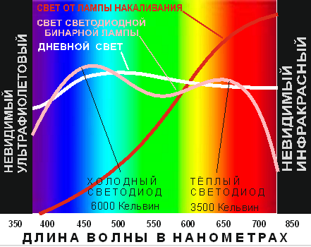 Получить его, искусственным путём тяжело. Все существующие ныне лампочки могут излучать только определённый участок этого “общего” диапазона, поэтому они маркируются так называемым термином - цветовая температура, который показывает какую “вырезку” диапазона белого они излучают: теплую (больше красного спектра) - 2500-3700 Кельвин, нейтральную (больше зелёного) - 3700-5000 Кельвин, холодную (больше синего спектра) - 5000-6500 Кельвин. Всё это “вырезки” отдельных участков из идеального белого. Именно поэтому “Светодиодные Технологии” изобрели бинарный свет - это смесь двух крайних широких участков белого спектра, которые соединяясь и дают наиболее широкий диапазон - приближённый к идеальному, как показано на спектрограмме.